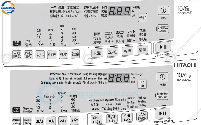 Bảng điều khiển là nơi bạn thực hiện mọi lệnh điều hành, vì vậy việc nhận diện các nút bấm là bước đầu tiên trong cách sử dụng máy giặt Hitachi. Đa số máy giặt Hitachi sẽ có các nút cơ bản như: Power, Start/Pause, Program, và các tùy chọn chỉnh tay như Water Level, Spin, Wash.